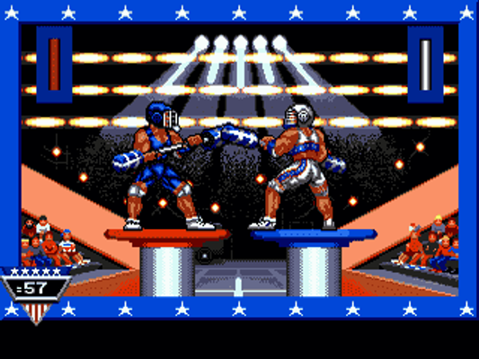 American Gladiators is licensed from the popular TV show of the same name. It features a series of events testing players' strength, speed and skill against a trained team of ten 'Gladiators', five male and five female. The female characters are Ice, Gold, Lace, Blaze and Zap, most of them know by their bodybuilding achievements. Main male characters are Turbo, Nitro (he featured several US National TV commercials), Gemini, Thunder and Laser (Mr. Montana on 1986).