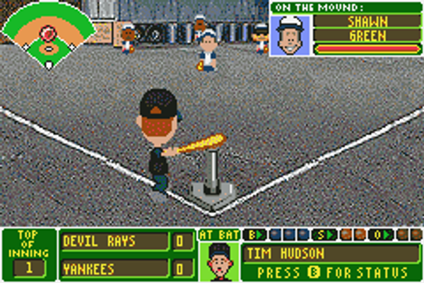 Create the baseball team of your dreams! It's great baseball action with the backyard kids and real pro players as kids. Pick your team, choose logos and playing fields. Play single games, an entire season or Home Run Derby. It's the chance of a lifetime to play with the pros right in your own backyard. Play single Games or a whole season, choose from all 30 Major League Baseball teams, create, save and trade custom players, practice your swing in the Home Run Derby, and track player and team stats in Season play. Also features a two-player multiplayer mode when linking up two Game Boy Advance units via a link cable.