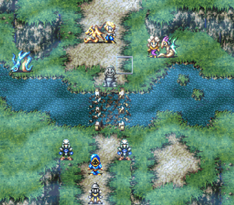 Bahamut Lagoon, created by the company which gave us the Final Fantasy games, is a mixture of turn-based strategy and RPG. Control several parties of four characters each, and command different dragons at once. The battles start on a top-down screen typical for strategy games, but often switch to a dynamic "platform" view, such as used in early console RPGs. You also can influence the game by other strategic activities, such as, for example, setting a whole forest on fire, to prevent enemies to come through it.