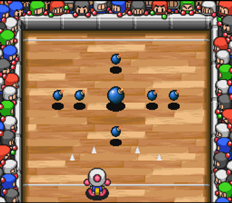 This game features puzzles that must be solved by shooting marbles. Bomberman can hold a marble in his stomach and can only fire one shot during the round. The player must angle it and time it correctly to detonate all of the bombs on screen.