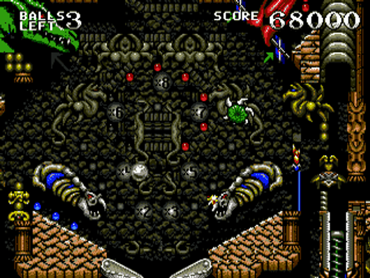 The table for this fantasy pinball game is three screens tall with medieval and dragon graphics. Each of the three screens has a pair of flippers at the bottom and the table elements are all animated and numerous monsters roam the screen.