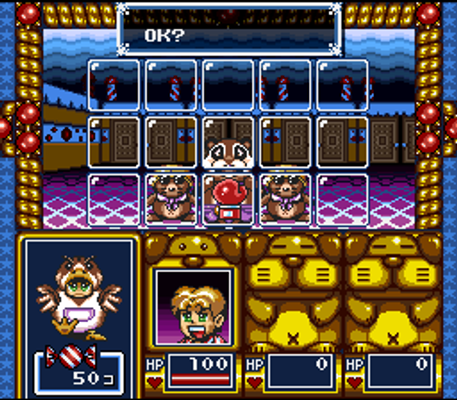 Yume Meiky?: Kigurumi Daib?ken is a first-person dungeon crawler with step-movement and random encounters that plays like a simplified version of the Dungeon Master series template, albeit with a turn-based engine. One of the main differences is the presentation: instead of the usual dank and dark dungeon with grim walls covered by rusty chains, this game has surfaces made of cake and candy. Instead of skeletons and orcs as enemies, it features furry and cute anthropomorphic animals. Once defeated, these creatures occasionally leave behind their skin, which the hero can collect and wear for a change in statistics and new abilities. They also sometimes drop candy, the game's currency. There are several shops on each level: a tailor shop to change and store skins (it is possible to carry a maximum of six skins), shops for potions and health boosts, etc.