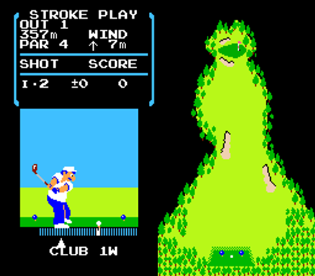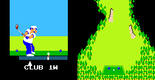Golf features two challenging 18 hole courses where players are able to play a round of golf, and allows players to choose a club, adjust stance and control the swing. The game features three alternating views; an overhead long-range view of the entire hole, an overhead medium-range view from the ball's current location, and an overhead close-range view of the green. Gameplay modes include 1 player, or 2 player play with a link cable.