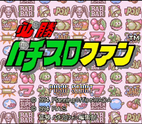 Hisshou! Pachi-Slot Fan ("Victory! Pachi-Slot Fan") is a pachi-slot simulator. It was published on the Super Famicom in 1994 by Planning Office Wada (POW) and developed by an unknown contract developer.