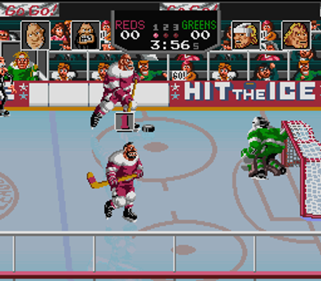 Hit the Ice is a fast-paced, high-impact hockey game based on the 1990 arcade game from Williams. Having more in common with Midway's Arch Rivals than any sane hockey simulation, this arena is no place for penalties, and no place for wimps. While the idea is still to somehow put the puck into the opposing team's goal, each team only has three players, there is a heavy focus on checking, and it is possible to do a "super shot" which is strong enough to send the goalie into the net along with the puck.