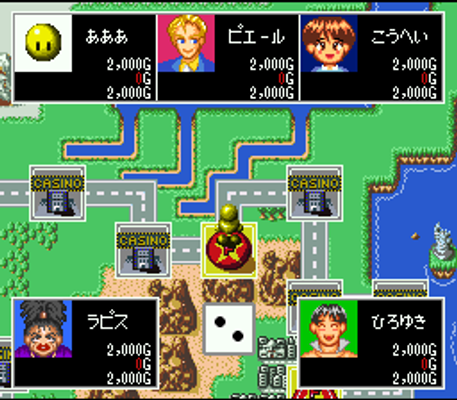 Miracle Casino Paradise is a gambling game that is framed as a Monopoly-style property acquisition board game. The game was published by Carrozzeria and an unknown developer: the title screen credits Yuzo Kashiro and his development studio Ancient, though it's not clear if they created the game or simply contributed to the music design.