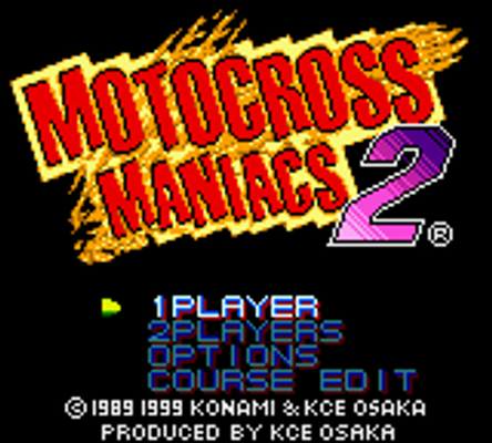 Motocross Maniacs 2 is the follow up to the Game Boy title Motocross Maniacs. Much like in the previous iteration of the game, the aim is to ride a dirt-bike through side-scrolling courses filled with loops, jumps, ramps and hills. There are many bonus items to help the player along the way, such as nitro boosts and super suspension.