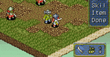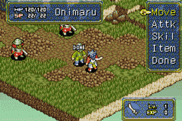 Onimusha Tactics is a turn-based strategy game between the player's side and the enemy's side. In each level you can bring a squad of no more than 10 people. There are no items to buy or sell, however equipment is available and customizable. Upgrades of existing weapons and armor can be done using the defeated souls of enemies absorbed into the Oni Gauntlet. New weapons and armor can be found or created through fusion of Genma Stones. Recipes must be found for each separate item before it can be fused.