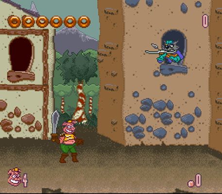 The player is put in the role of Bruno, an anthropomorphic pig who has the task to defend his land which is currently under siege by wolves. Bruno comes equipped with a sword and the ability to throw donuts that he finds throughout the six levels of the game. Bruno also has the ability to jump and to also butt slam crates. No description of this game would be complete without mentioning the blowholes which are liberally sprinkled throughout each level. These blowholes will lift Bruno in the air so that he will be able to get to higher plateaus that he simply couldn't get to by just jumping normally.
