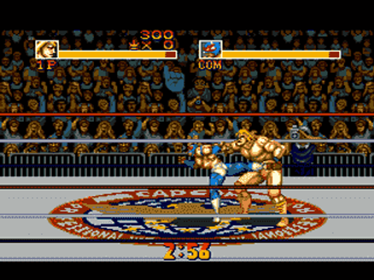 Ten wrestlers with different fighting styles and individual special attacks are available. They are controlled with three buttons; one for jumping, one for attacking and one for pinning. When close to your opponents, you can grab them to perform various moves ranging from ordinary attacks to body slams to throws. Since the action takes place in a ring, it is also possible to climb the turnbuckle or use the ropes to your advantage. You can also leave the ring for a limited amount of time to fight with different weapons that can be found outside the ring.