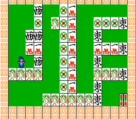 Shi-Kin-Joh ("Forbidden City") is a puzzle game similar to Sokoban in which the player must reach a goal by pushing oversized mahjong tiles which block the path. When two matching tiles are pushed next to each other, they disappear.