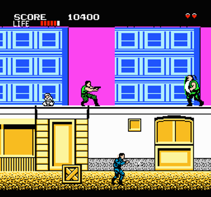 Each level is broken down into smaller scenes and hostages are guarded by big blokes who throw swords. Watch out for gun-toting enemy henchmen and ninjas.
