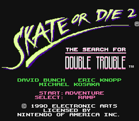 In this sequel to Skate or Die, you have the option of just skateboarding on a ramp, or to go through an adventure. In the adventure, you are in a small community called Elmood. You play as the hero in this game. Basically you are trying to keep skateboarding and your life as it was after the Mayor of the town bans skateboards. After dealing with this, you set out to build your own halfpipe, and you deal with whatever comes your way. In this game, you go through many obstacles, and other skateboarders shooting paint and throwing eggs at you, you also can shoot at them, and of course upgrade your board from Lester when you run into him on his skateboard, as well as Lester who will give you tricks (giving them whatever they want, whether that's fries, drinks, CD's, etc;).