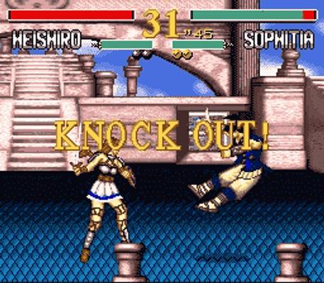 Soul Blade is a pirated port of the PlayStation game of the same name, made for the SNES and Sega Genesis by an unknown developer in 1997. The controls are considered bad, as there is a delay when attacking your opponent.