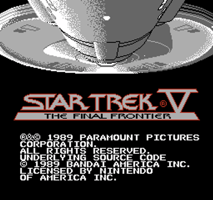 Star Trek V: The Final Frontier was a 2D platform game which was developed by Bandai for the NES (Nintendo Entertainment System). It was based on Star Trek V: The Final Frontier but was canceled before its intended release.