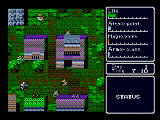 Super Hydlide continues the tradition of action RPGs started with the original Hydlide for NES. You can choose to play as one of the four character classes: Warrior, Thief, Priest, and Monk. In combat, you use melee or long-ranged weapons or cast magic spells in real time. There is an internal clock in the game that makes it necessary for you to sleep periodically to regain your strength. You also have to eat from time to time, otherwise your hit points will gradually decrease.