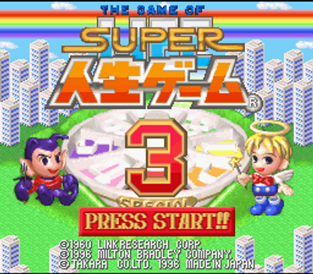 Super Jinsei Game 3 ("Super Life Game 3") is the third of three games released on the Super Famicom to be based on the Jinsei Game board game from Takara, which is actually a translated version of Milton Bradley's The Game of Life.