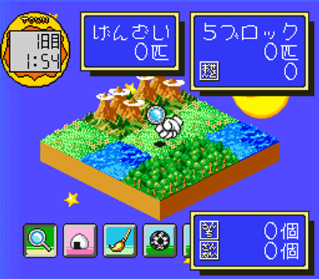 The goal of the game is to create a large Tamagotchi society on a given piece of land containing different landscapes.The game features a unique way of raising Tamagotchis through interactivity with their environment.
