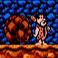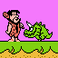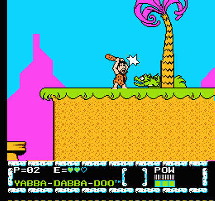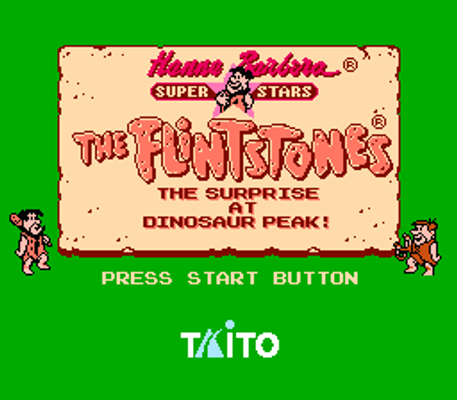 The Surprise at Dinosaur Peak is the second Flintstones-licensed game for the NES. There are two characters you can play with. By pressing the Select button you can change from Fred to Barney and vice versa. Each character has unique abilities that are needed to complete certain parts of each stage. For example Fred can grab the edges of a roof or a hill and climb while Barney can hang from ropes and vines. In terms of weapons Fred has a bat which is stronger and can also be charged for extra power but it takes more time to use. Barney on the other hand has a slingshot and can shoot small rocks for ranged attacks but rather weak. There are also weapons like throwing axes and bowling balls that both can use.