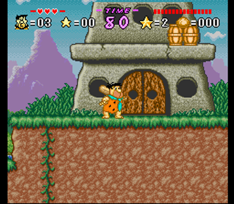 Most fields require you to finish a side-scrolling platforming level. Fred and Barney can jump, club their enemies and climb trees or stone pillars. Holding down the jump button lets them hover in the air for a short moment. Throughout the levels, different power-ups and items can be found: clamps are used as money, apples replenish some health, 100 stars grant an extra life to Barney or Fred and an empty Heart frame increases their life bar.