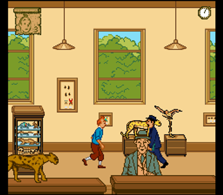 The gameplay itself is a typical platforming action: Tintin walks through the levels while avoiding the enemies. Pretty much everyone, e.g. little girls and security guards, is out to hurt Tintin who has no means of defending himself. This means the most important aspect is learning enemy placements, their patterns and how to avoid them. But he has to hurry because of the time limit. Required for success is the usage of the two playing plains: from the player's perspective in the foreground and further towards the background. Tintin can switch between the two at any time.