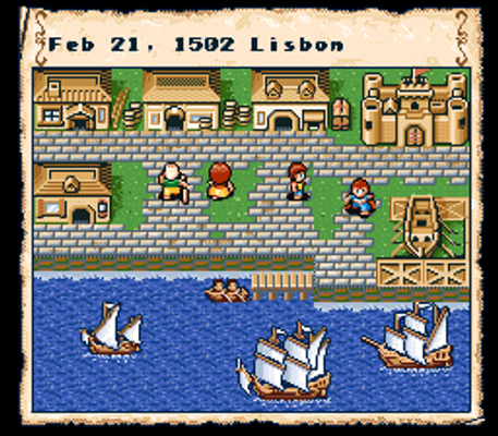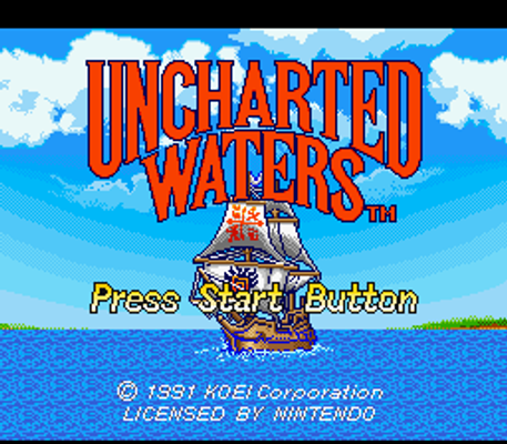 Uncharted Waters is a sailing and trading simulation. Your goal is initially to sail between ports and trade goods between them to make a profit. Along the way, you may be called upon by merchants and royalty to do specific tasks. Several different nations as well as pirates roam the sea and not all have good relations with one another. You can take as long as you want and explore as much of the world as possible to complete your ultimate task of marrying Christiana, which will require your fame rating to be quite high anyway. Available at most ports is a trader for cargo, a supply station for your crew's food and water as well as repairs, a shipbuilder, an item store and finally a pub for gaining information, crew and gambling.