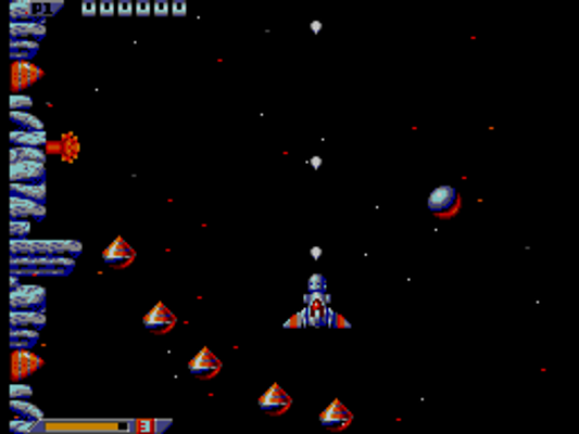The first part of the game has an organic feel to it, while the second part of the game features mechanical enemies. As there are some maze-like sections with dead-ends in the game, your spaceship scrolls backwards when you keep pressing the down key.