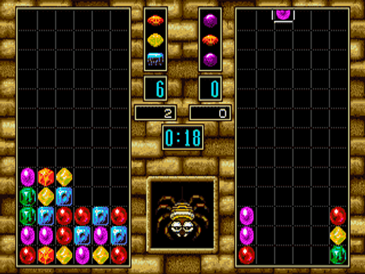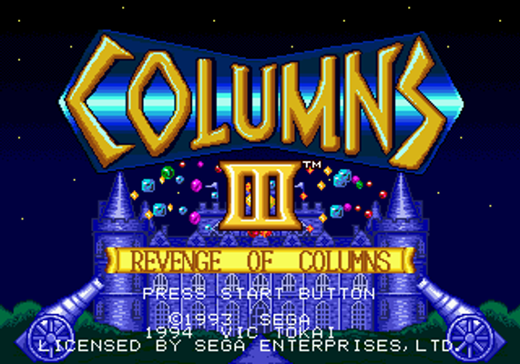 Third game in the Columns series. In this fast-paced puzzle mayhem, your goal is to arrange three or more jewels of the same colour horizontally, vertically or diagonally to remove them from the playing screen. While the jewels are falling, you can change the order of their colours. In the Arcade, Versus, and Time Trial modes, you can test your skills against an opponent, a clock, or a specific task such as removing a particular jewel. New features include a rising bar that can be used to annoy opponents and magical items that have strategic value to alter the outcome mid-game.