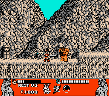 Long ago the Crystal Palace was a thriving kingdom, however the evil war spirit Zaras appeared one day and brought destruction to the lands! The people of the Crystal Palace left as Zaras and his henchman took over, changing the kingdom into a maze of many dangers. You control Farron, the hero of the story who needs to enter the Crystal Palace and destroy the bad guys in order to restore peace. The game is an action platform game that scrolls both horizontally and vertically. On each of five stages you'll need to fight various enemies throughout the varied terrain, and finally defeat the boss at the end. You'll start with just a simple sword, but additional weapons can be found or bought in order to help you out. If you get into trouble, you can also call your dog Zap onto the screen; he'll jump around causing damage to the enemies giving you a chance to escape. You may also come across Kim's shops along your journey. Here you can buy various items, including additional lives, replenish your health, more powerful weapons, and other useful items. To purchase items, you'll need money which can be collected after defeating enemies in battle.