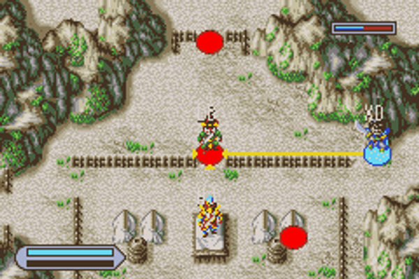 Dynasty Warriors Advance is a top-down turn-based strategy board game, but with a focus on action combat. Since it is based on the earlier Dynasty Warriors titles, many of the same concepts carry over. Players begin by choosing one of three available characters from the lands of either Wu, Shu or Wei. Each character has their own unique storyline and missions. A briefing is given for each mission detailing specific objectives before allowing the player to equip themselves with weapons and skills at the camp. Once begun, the player moves the designed number of spaces (determined by movement) around the "board". If an enemy player is encountered, the game shifts to a top-down action fighting mode. Here the player uses one button to attack, another button to charge and another to unleash a misou special attack once it is powered up. Misou energy is charged by successful attacking enemy units. The player's success against the enemy unit will determine the unit's "heath" and will be destroyed completely if all of it's units are destroyed. Some enemy units contain not just soldiers but enemy generals who have their own special moves and greater health. Many missions feature specific objectives rather than just defeating all enemies.