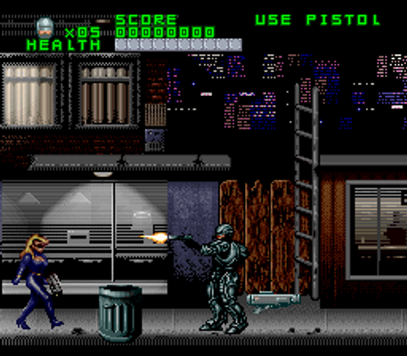 In the game you control Robocop who may move across the screen, jump, fire and exchange weapons. Robocop starts with the Auto-9 which has unlimited ammunition... other weapons may be more powerful but contain limited ammo. Beginning the game on a mission of law enforcement, you soon meet up with Flo and must engage in battle against Terminators, the forces of OCP and several obstacles