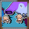 There are many enemies to battle in the game. The battles are turn-based; each turn, a character can attack with his weapon, use a special ability (some characters have powerful psychic abilities, others have different special skills), use an item or try to run away. The battles feature a musical combo system, where tapping a button in rhythm with the background music will cause additional damage to the enemy. The characters have "rolling HP meters"; when they are dealt damage, they don't lose all the HP right away, but their HP decreases slowly; this way, even if a character receives massive damage, he can survive with only minor injuries if you manage to end the combat quickly. Winning battles gives the characters experience (and thus makes them stronger) and, later in the game, money (known as "DP"), which can be used in shops to buy better equipment or useful objects.