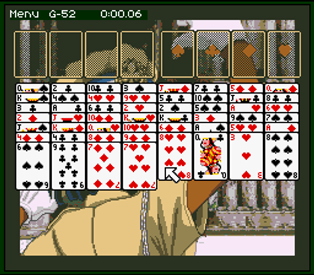 Super Solitaire is a SNES version of the classic solitaire card game with 12 varieties of play (Klondike, Free Cell, Golf, Cruel, Pyramid, Stonewall, Doesn't Matter, Aces Up, Florentine, Poker, Canfield and Scorpion). It features classic artwork for backgrounds along with optional cartoony graphics. Very soft music is included on the track. The game also sports options where you can choose to skip to the next card when stuck or get a hint on what to do.