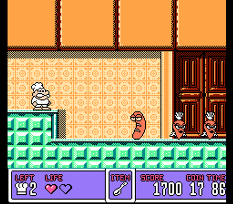 It is a fairly basic platform game. You run and jump, and enemies are placed all around to try and stop you. The entire game, backgrounds, enemies and bosses, is food-themed. You encounter things such as sausages, microwave ovens, onions and hamburgers on your way through the restaurant. To your help you always have a frying pan to beat the enemies with, and you can also find other items, such as a spoon, and plates to throw at the enemies.