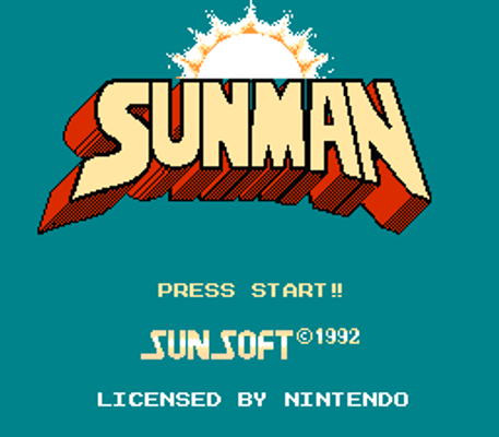 Sunman is an unreleased action video game developed by EIM and planned to be published by Sunsoft for the Nintendo Entertainment System in 1992. Despite being mostly complete, it was never commercially released. Also, unlike most video games of this time, it was never even announced. Most cancelled games saw months' worth of publicity in video game magazines before fading off the game-watch radars. The gameplay is very similar to Sunsoft's Batman games, Batman and Batman: Return of the Joker, in that the character can run, jump, punch and duck, although in this game the player can also fly simply by pushing up. There are also some side scrolling flying levels where you can shoot laser/heat vision from your eyes. The game is divided into five scenes with one-four areas with a boss at the end of each area.