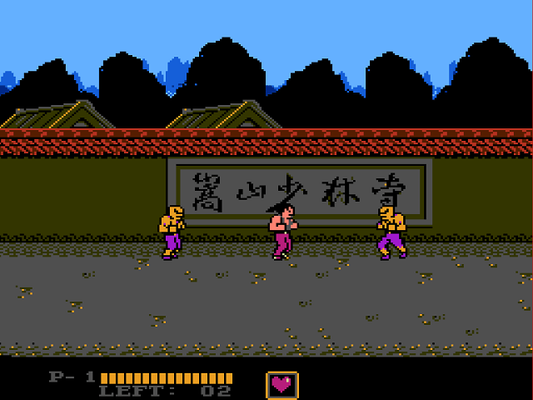 Challenge of the Dragon, aka Chinese Kungfu (similar to Double Dragon and unrelated to the Color Dreams game of the same name; credits show the Joy Van logo indicating that this was started before the Joy Van/Sachen merge. Chinese Kungfu version features a basic jump move instead of a jump kick.)